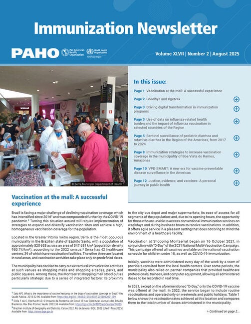 The Pan American Health Organization (PAHO) publishes the Immunization Newsletter in Spanish, English, French, and Portuguese. Its purpose is to facilitate the exchange of ideas and information on immunization programs in the Region of the Americas and beyond. The English and Spanish versions have been published since 1979, while those in French and Portuguese have been published since 2001 and 2019, respectively. The August 2025 issue of the Immunization Newsletter includes the following articles: Vaccination in shopping malls in Brazil: a successful experience to achieve a high, homogeneous vaccination coverage for the population; Driving digital transformation in immunization programs with a new virtual course on electronic immunization registries (EIRs) in PAHO's Virtual Campus for Public Health; Use of data on influenza (or flu)-related health burden and the impact of influenza (or flu) vaccination in selected countries of the Region, with information on a workshop for the generation of evidence to support health policies for the prevention and control of seasonal influenza; Sentinel surveillance of pediatric diarrhea and rotavirus diarrhea in the Region of the Americas, from 2017 to 2024; Immunization strategies to increase vaccination coverage in the municipality of Boa Vista Do Ramos, Amazonas in Brazil; VPD-SMART: a new era for vaccine-preventable disease surveillance in the Americas; Justice, evidence, and vaccines: a personal journey in public health By Hugo Rázuri, Deputy Manager of the PAHO Special Program on Comprehensive Immunization (CIM); and a farewell from associate editor of the Immunization Newsletter for the past 12 years, Octavia Silva.