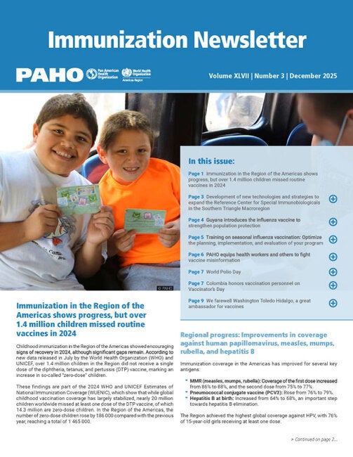 The Immunization Newsletter is information about immunization programs in the Region of the Americas and beyond. The English and Spanish versions have been published since 1979, while the French and Portuguese versions began to be published in 2001 and 2019, respectively. The December 2025 issue of the Immunization Bulletin includes articles on 2024 vaccination coverage data published on July 2025 by WHO and UNICEF. The region shows progress in coverage, but there are still more than 1.4 million children who have not received doses. Brazil's immunization experience in developing new technologies and strategies.Brazil has launched Reference Centers for Special Immunobiologicals (CRIE). These are services aimed at groups of people who are more susceptible to diseases or at risk of complications for themselves or others.This number also have an articla about the introduction of the influenza vaccine in Guyana. Its main objective is to provide a clear overview of the scientific evidence and key aspects for the prevention and control of influenza. This edition have an article about the 6 guidelines published by CIM communication specialists on how to combat misinformation about vaccines for health workers, EPI Managers, Journalists, Educators, Communicators and Content creators. We have celebrated 31 years of the region free of wild polio and we publish some actions we made on the World Polio Day, 24th October, with Dr. Jarbas Barbosa message, and the interviews to CIM advisor made by content creators. In Colombia, they celebrated Vaccinator Day, and to finish, we publish the farewell to Washington Toledo, who passed away in 2025. |