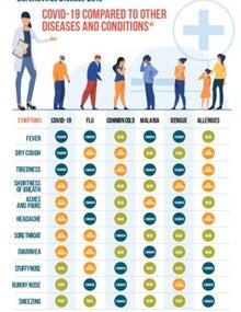 This is an infographic with relevant information on the symptoms associated with COVID-19 and its similarities and differences with other ailments or diseases.