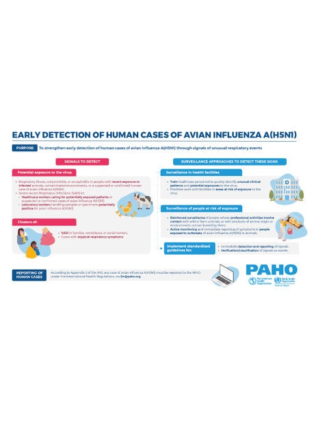 The infographic "Early Detection of Human Cases of Avian Influenza A(H5N1)", developed by the Pan American Health Organization (PAHO), provides technical guidance to strengthen the early identification of human cases in the Region of the Americas. It includes recommendations on: - Key signals for the early detection of potential cases.