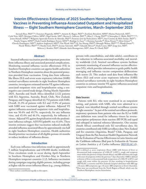 Seasonal influenza vaccination provides important protection from influenza illness and associated potential complications. Monitoring seasonal influenza vaccine effectiveness (VE) in Southern Hemisphere countries can apprise health authorities in Northern Hemisphere countries about the potential protection provided from vaccination. Using data from influenza-like illness (ILI) and severe acute respiratory infection (SARI) sentinel surveillance networks in eight Southern Hemisphere countries, investigators estimated interim VE against influenza-associated outpatient visits and hospitalization using a test-negative case-control study design. During March–September 2025, Australia and South Africa identified 2,122 patients with ILI; Argentina, Australia, Brazil, Chile, New Zealand, Paraguay, and Uruguay identified 42,752 patients with SARI. Overall, 21.3% of patients with ILI and 15.9% of patients with SARI were vaccinated against influenza. Adjusted VE against influenza-associated outpatient visits and hospitalization was 50.4% and 49.7%, respectively, for any influenza virus, and 45.4% and 46.1%, respectively, for influenza A viruses. Adjusted VE against hospitalization with the predominant influenza subtype, A(H1N1)pdm09, was 41.6%. These interim estimates suggest that vaccination reduced medically attended influenza-associated illness by approximately one half in eight Southern Hemisphere countries. Health authorities should prioritize vaccination of all eligible persons ≥6 months to reduce incidence of influenza disease.