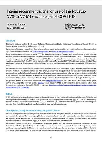 These WHO interim recommendations for use of the COVID-19 vaccine Novavax NVX-CoV2373 were developed on the basis of advice issued by the Strategic Advisory Group of Experts on Immunization (SAGE) and the evidence summary included in the background document and annexes.