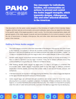 This document is for the vector control programs of the Ministries of Health of PAHO Member States. Together with their national communication and social mobilization teams, they can adapt this information to the specific needs of the target population in each country. The information presented below deals with general aspects of the Aedes aegypti mosquito and recommendations for its control to prevent or reduce the risk of transmission of dengue, chikungunya, Zika, and other urban arboviruses transmitted by this vector in the Americas. |