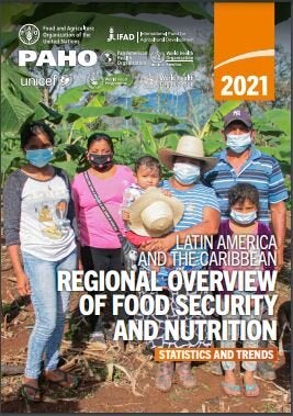 This edition of the Regional Overview of Food Security and Nutrition 2021: Statistics and Trends reveals a bleak scenario for the future. In 2020, 59.7 million people in our region suffered from hunger, and between 2019 and 2020 the prevalence of hunger in Latin America and the Caribbean increased by 2 percentage points. The increases in moderate or severe food insecurity from 2019 to 2020 were even steeper than the increase in hunger at 9 percentage points. Forty-one percent of the regional population is moderately or severely food insecure: that is 267 million people whose human right to food is not being met. In the Region, one in four adults suffer from obesity. Childhood overweight has been increasing over the last 20 years and is above the world average: it affected 7.5 percent of children under five in 2020.