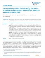 [ABSTRACT]. Objective. To describe the life expectancy, healthy life expectancy, disease burden, and leading causes of mortality and disability in adults aged 65 years and older in the Region of the Americas from 1990 to 2019. Methods. We used estimates from the Global Burden of Disease Study 2019 to examine the level and trends of life expectancy, healthy life expectancy, years of life lost, years lived with disability, and disability-adjusted life years (DALYs). Results. Across the Region, life expectancy at 65 years increased from 17.1 years (95% uncertainty intervals (UI): 17.0–17.1) in 1990 to 19.2 years (95% UI: 18.9–19.4) in 2019 while healthy life expectancy increased from 12.2 years (95% UI: 10.9–12.4) to 13.6 years (95% UI: 12.2–14.9). All-cause DALY rates decreased in each older persons’ age group; however, absolute proportional DALYs increased from 22% to 32%. Ischemic heart disease, stroke, and chronic obstructive pulmonary disease were the leading causes of premature mortality. Diabetes mellitus, age-related and other hearing loss, and lower back pain were the leading causes of disability. Conclusion. The increase in life expectancy and decrease of DALYs indicate the positive effect of improvements in social conditions and health policies. However, the smaller increase in healthy life expectancy suggests that, despite living longer, people spend a substantial amount of time in their old age with disability and illness. Preventable and controllable diseases account for most of the disease burden in older adults in the Americas. Society-wide and life-course approaches, and adequate health services are needed to respond to the health needs of older people in the Region.