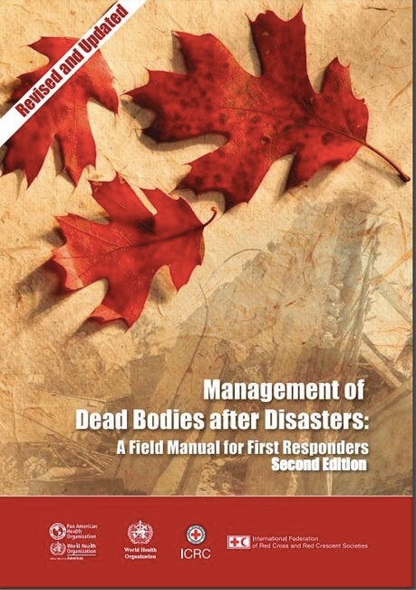 This manual has two aims: first, to promote the proper and dignified management of dead bodies and, second, to facilitate their identification. Following many disasters, and certainly larger ones, the retrieval and immediate management of dead bodies is done by local authorities, organizations and communities, residents and volunteers. This is because forensic experts may not arrive for some days, or even longer; and in some contexts, there are no forensic experts at all. Consequently, this manual focuses on practical recommendations for those who are on the spot or are able to respond in the immediate aftermath of a disaster – i.e. first responders. The second edition of this publication reflects scientific and technical developments in the field of mass fatality management, and lessons learned from the use of the manual. When a major disaster strikes, the first people on the scene are often local organizations, residents and volunteers. They are often faced with the retrieval and immediate management of dead bodies before forensic experts can arrive. "Management of dead bodies after disasters: a field manual for first responders" provides practical, easy-to-follow guidelines to ensure proper and dignified management of dead bodies after disasters. If first responders know how to take the proper steps in dealing with dead bodies, they can help future work by forensic specialists and investigators in identifying human remains and clarifying the fate of missing persons.