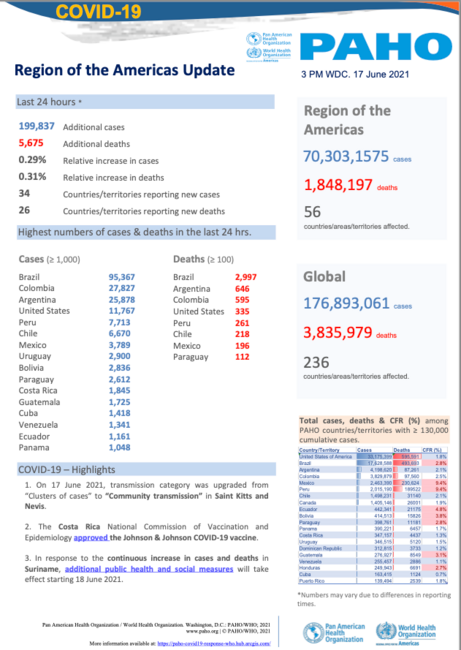 PAHO Daily COVID-19 Update: 17 June, 2021