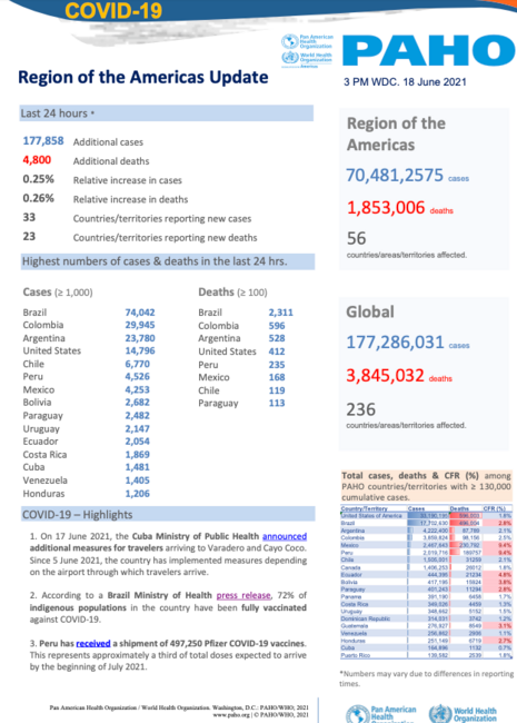 PAHO Daily COVID-19 Update: 18 June, 2021