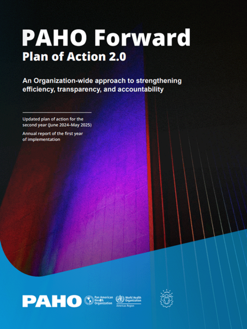 PAHO Forward is a results-based, Organization-wide initiative to systematically innovate and modernize management practices to increase efficiency, transparency, and accountability internally and externally. The PAHO Forward Plan of Action 2.0 operationalizes the PAHO Forward framework and includes the specific objectives of strengthening the Pan American Sanitary Bureau (PASB) efficiency, transparency, and accountability; bolster the Pan American Health Organization (PAHO) visibility, country focus, and capacity to deliver technical cooperation; enhance the PASB human resources performance and drive innovation to move the Organization forward. This report describes the main components of the updated plan, and outlines the full list of actions and expected results that have been prioritized by PAHO Forward Governance for the period June 2024 to May 2025. |