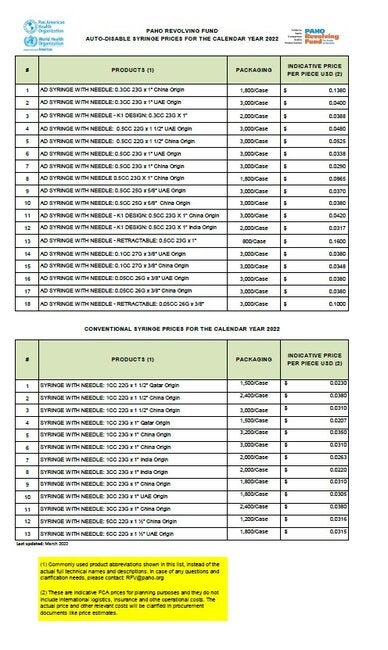 PAHO Revolving Fund Syringes Prices for 2022