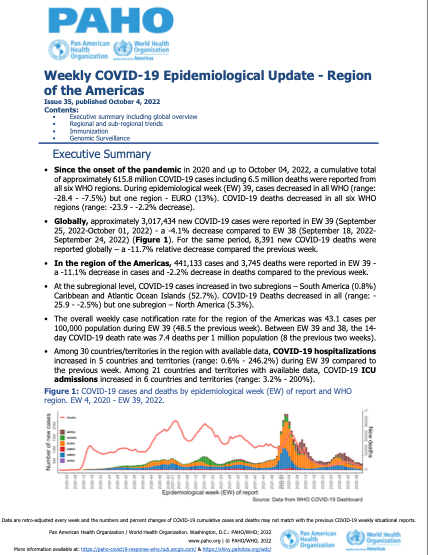 In the region of the Americas, 441,133 cases and 3,745 deaths were reported in EW 39 - a -11.1% decrease in cases and -2.2% decrease in deaths compared to the previous week.