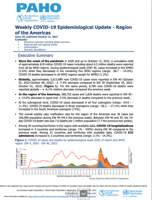 The overall weekly case notification rate for the region of the Americas was 38 cases per 100,000 population during EW 40 (44.5 the previous week). Between EW 40 and 39, the 14- day COVID-19 death rate was 7.6 deaths per 1 million population (7.7 the previous two weeks).