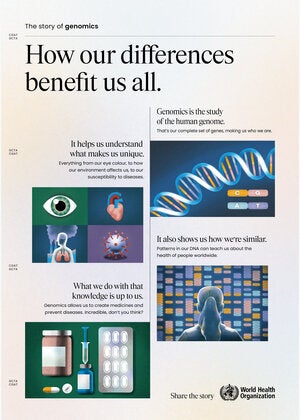 This poster is the first in a series of four on “The Story of Genomics,” developed in English by the World Health Organization (WHO) and translated into Spanish by the Pan American Health Organization (PAHO). The posters are available as PDFs for download. Series “The story of genomics” - Poster 1 – How our differences benefit us all