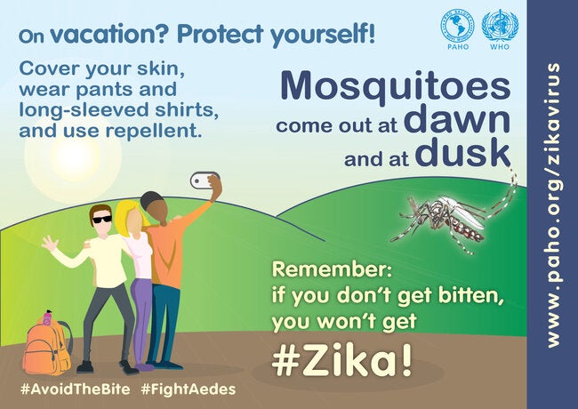 Poster: On vacation? Protect yourself. Mosquitoes come out at dawn and at dusk