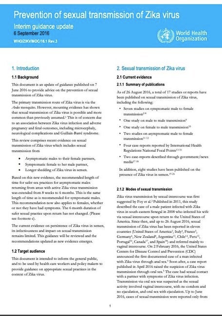 CitationWorld Health Organization. (2016). Prevention of sexual transmission of Zika virus: interim guidance update. World Health Organization. https://apps.who.int/iris/handle/10665/204421 Description5 p. Document numberWHO/ZIKV/MOC/16.1 Rev.3 PDF: |