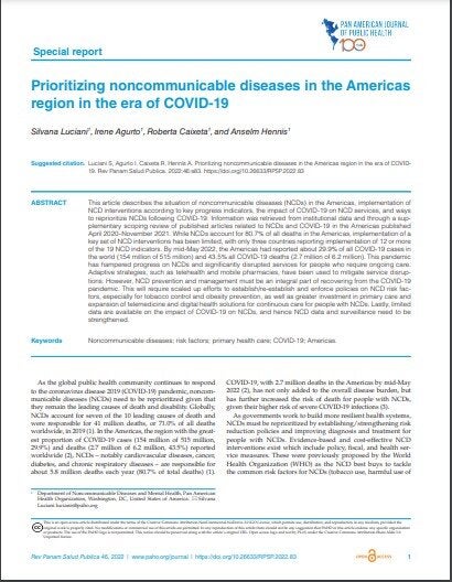 [ABSTRACT]. This article describes the situation of noncommunicable diseases (NCDs) in the Americas, implementation of NCD interventions according to key progress indicators, the impact of COVID-19 on NCD services, and ways to reprioritize NCDs following COVID-19. Information was retrieved from institutional data and through a sup- plementary scoping review of published articles related to NCDs and COVID-19 in the Americas published April 2020–November 2021. While NCDs account for 80.7% of all deaths in the Americas, implementation of a key set of NCD interventions has been limited, with only three countries reporting implementation of 12 or more of the 19 NCD indicators. By mid-May 2022, the Americas had reported about 29.9% of all COVID-19 cases in the world (154 million of 515 million) and 43.5% all COVID-19 deaths (2.7 million of 6.2 million). This pandemic has hampered progress on NCDs and significantly disrupted services for people who require ongoing care. Adaptive strategies, such as telehealth and mobile pharmacies, have been used to mitigate service disrup- tions. However, NCD prevention and management must be an integral part of recovering from the COVID-19 pandemic. This will require scaled up efforts to establish/re-establish and enforce policies on NCD risk fac- tors, especially for tobacco control and obesity prevention, as well as greater investment in primary care and expansion of telemedicine and digital health solutions for continuous care for people with NCDs. Lastly, limited data are available on the impact of COVID-19 on NCDs, and hence NCD data and surveillance need to be strengthened.