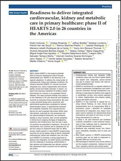 AbstractWHO’s Global HEARTS is the largest worldwide effort to improve hypertension control through standardised care. HEARTS in the Americas is its regional adaptation. To address the rising burden of cardiovascular, kidney and metabolic conditions, the initiative launched HEARTS 2.0, aiming to promote integrated care, reduce fragmentation and improve quality, access and health outcomes. In phase I, an expert-led consensus identified 45 evidence-based interventions for inclusion in an expanded Clinical Pathway. This report presents findings from phase II on the readiness of 26 Latin American and Caribbean countries to implement these interventions. We used a cross-sectional design and a structured, self-administered questionnaire completed by national implementation teams. It systematically assessed the availability, feasibility, time required and key barriers for each proposed intervention. While many interventions, especially for risk assessment and non-pharmacological treatments, are considered feasible in many countries, their current availability is limited due to ongoing shortages of diagnostics, medicines and infrastructure. Over the next 3 years, 18 countries are projected to implement >30 of the 45 interventions, four countries aim to implement 20–30 and four expect to implement fewer than 20. While primary health systems in most HEARTS-implementing countries do not yet appear ready to deliver integrated cardiovascular, kidney and metabolic care, the scale-up of HEARTS 2.0 presents a strong opportunity to advance this integration. As health systems worldwide face the challenge of increasing multimorbidity in their patients and fragmented care delivery systems, this assessment offers a practical tool for planning and action. |
