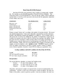 Real time RT-PCR can be performed using a number of commercially available kits. We currently use the QIAGEN QuantiTect Probe RT-PCR kit (#204443). The setup shown in this document is for the QIAGEN kit. Note also that the volume of RNA added per reaction below is 10 ul but can be increased or decreased with the appropriate adjustment of total volume with water |