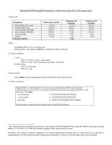 This document provides detailed instructions for conducting real-time RT-PCR assays to detect the yellow fever virus, specifically the YFV 17D vaccine strain. It includes information on the preparation of the master mix, cycling conditions, and interpretation of results. The protocol is designed to ensure accurate and reliable detection of the virus in various samples. |