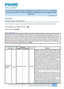 After more than 22 months of the ongoing COVID-19 pandemic in the Region of the Americas, and COVID-19 cases and deaths have been reported from all 56 countries and territories in the Region of the Americas, health systems are still being challenged and routine immunization activities are still behind in most of countries. The pandemic has affected compliance with the vaccine-preventable diseases (VPDs) surveillance indicators. Furthermore, imposed restrictions on movement as well as concerns due to the pandemic have limited primary healthcare activities, including preventive services such as vaccination, with a consequent decline in the vaccination coverage and an increase of the susceptible population. In addition, the migration phenomena in the Region, the relaxing of public health and social measures, and the impact of COVID-19 on the capacity of the healthcare systems, have led to challenges. Therefore, the occurrence of new outbreaks of VPDs of varying magnitude in the Americas Region cannot be ruled out, and the regional risk remains assessed as Very High.