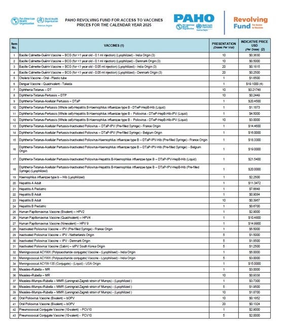 Prices for vaccines in 2025 for the PAHO Revolving Fund for Access to Vaccines