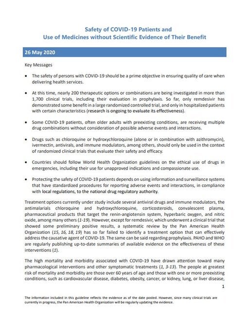 COVID-19 treatment options currently under study include several antiviral drugs and immune modulators, the antimalarials chloroquine and hydroxychloroquine, corticosteroids, convalescent plasma, pharmaceutical products that target the renin-angiotensin system, hyperbaric oxygen, and nitric oxide, among many others. However, except for remdesivir, which underwent a clinical trial that showed some preliminary positive results, a systematic review by the Pan American Health Organization has so far failed to identify a treatment option that can effectively address the causative agent of COVID-19. The same can be said with regard to prophylaxis. PAHO and WHO are regularly publishing up-to-date summaries of available evidence on the effectiveness of these interventions.