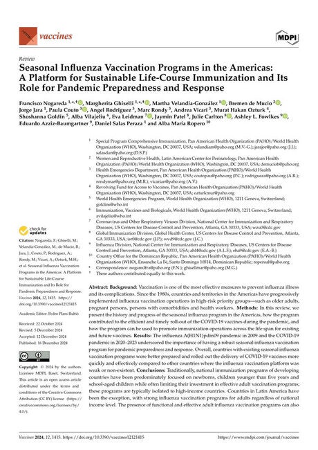 AbstractBackground: Vaccination is one of the most effective measures to prevent influenza illness and its complications. Since the 1980s, countries and territories in the Americas have progressively implemented influenza vaccination operations in high-risk priority groups—such as older adults, pregnant persons, persons with comorbidities and health workers. Methods: In this review, we present the history and progress of the seasonal influenza program in the Americas, how the program contributed to the efficient and timely roll-out of the COVID-19 vaccines during the pandemic, and how the program can be used to promote immunization operations across the life span for existing and future vaccines. Results: The influenza A(H1N1)pdm09 pandemic in 2009 and the COVID-19 pandemic in 2020–2023 underscored the importance of having a robust seasonal influenza vaccination program for pandemic preparedness and response. Overall, countries with existing seasonal influenza vaccination programs were better prepared and rolled out the delivery of COVID-19 vaccines more quickly and effectively compared to other countries where the influenza vaccination platform was weak or non-existent. Conclusions: Traditionally, national immunization programs of developing countries have been predominately focused on newborns, children younger than five years and school-aged children while often limiting their investment in effective adult vaccination programs; these programs are typically isolated to high-income countries. Countries in Latin America have been the exception, with strong influenza vaccination programs for adults regardless of national income level. The presence of functional and effective adult influenza vaccination programs can also facilitate the acceptance and uptake of other adult vaccines targeting priority groups at higher risk for severe illness or complications. Vaccines 2024, 12(12), 1415; https://doi.org/10.3390/vaccines12121415 |