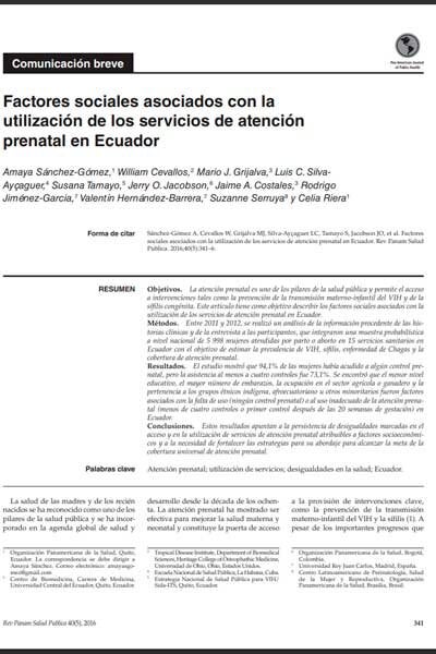 Prenatal care is a pillar of public health, enabling access to interventions including prevention of mother-to-child transmission of HIV and congenital syphilis. This paper describes social factors related to use of prenatal care in Ecuador.