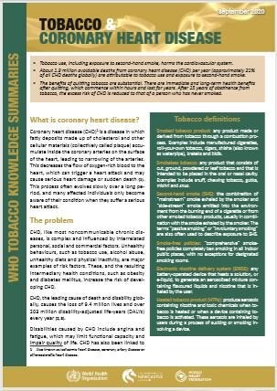 This document is the fifth in a series of Tobacco Knowledge Summaries. This document was prepared with the objective to summarize the association between tobacco use and coronary heart disease, as well as describe the benefits of quitting to reduce excess risk of heart disease. This is also intended as an advocacy tool to widely include health care professionals in the fight for tobacco control and prevention of tobacco-related adverse health effects.
