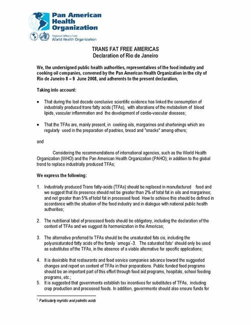 Document signed by public health authorities, representatives of the food industry and cooking oil companies, convened by the Pan American Health Organization in the city of Rio de Janeiro 8 – 9 June 2008.