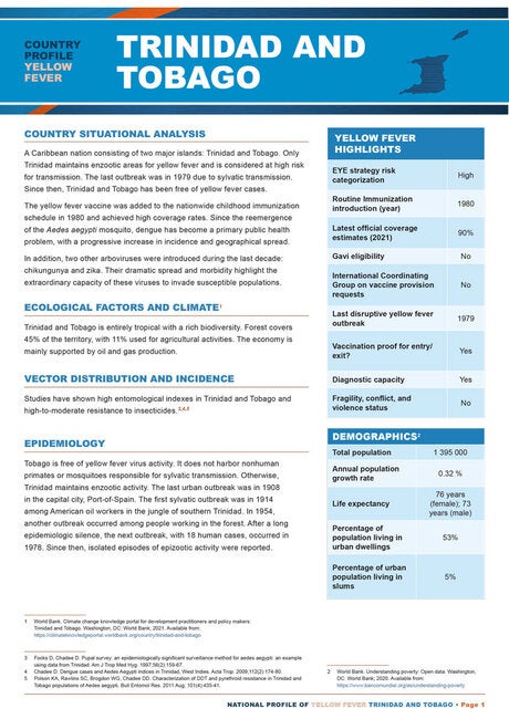 Yellow fever is endemic in several Latin American countries. In order to support decision-makers in prioritizing preventive actions against this disease, the Pan American Health Organization presents these country profiles with a concise and comprehensive selection of data from endemic countries. Each profile provides an analysis of the country's current situation, ecological and climatic factors associated with the disease, vector distribution and incidence, and key arboviral activity. It also includes a historical perspective of the epidemiology and a summary of the status of vaccination against the disease in the country.