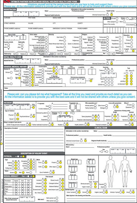 The Trinidad and Tobago Intimate Partner Violence and Sexual Violence Health Care Form is designed to be filled out by a health care worker after a patient has disclosed that they have been subjected to intimate partner violence or sexual violence. It is available for completion on paper or electronically as a module of the Perinatal Information System, SIP-Plus. The variables in the form conform with the history-taking, assessment, and documentation protocols included in the National Clinical and Policy Guidelines on Intimate Partner Violence and Sexual Violence. The use of the form enables the generation of data to monitor and evaluate the quality of health care for survivors, and thus to strengthen health care.