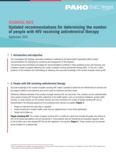 This technical note summarizes the consolidated guidelines and adapts them to the context of Latin America and the Caribbean, in order to adequately monitor the number of people on ART. For this purpose, guidance is presented on the indicators and the methodology to know more precisely the number of people who are in ART.