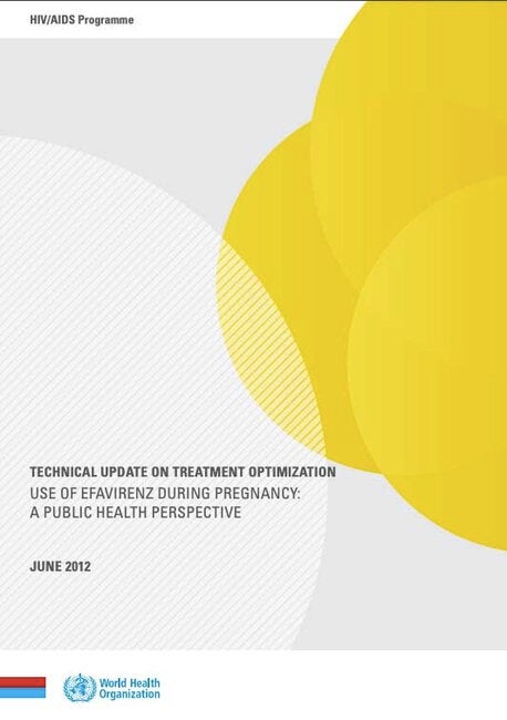 This technical update reviews the evidence on the safety, tolerability and efficacy of EFV, as well as the clinical and programmatic consequences of multiple algorithms due to uncertainty regarding the risk of teratogenicity from the use of EFV in pregnancy. Review of the available data and programmatic experience provides reassurance that exposure to EFV in early pregnancy has not resulted in increased birth defects or other significant toxicities. In addition, new evidence suggests that EFV is clinically superior to NVP, as it provides better long-term viral suppression, has fewer adverse events and less risk of resistance. Finally, the cost of EFV has decreased considerably, and it is now increasingly available as part of once-daily fixed-dose combinations. Based on the available data, programme experience and a public health perspective, this interim guidance provides further support for the use of EFV as part of the World Health Organization (WHO) strategy to optimize and simplify first-line treatment, including among pregnant women and those of reproductive age. Further review of the safety of EFV and its use in pregnant women and those of reproductive age will be included as part of a comprehensive revision of the WHO ART guidelines, planned for 2013.