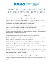 Good morning. Thank you for joining us for this press briefing today. Last week, there were more than 490,527 COVID cases reported in the Americas – a nearly 2.3% decrease as compared to the prior week. A total of 4,797 deaths were also recorded, representing a 15.2% decrease compared with the previous week. In North America, cases increased by 11.2%, and in Canada hospitalizations also rose by more than 20%, as the proportion of Omicron BA.2 cases grew in the country. As borders have re-opened and tourism has ramped up, cases have also surged in some Caribbean countries and territories, with Saint Kitts and Nevis, Saint Lucia, Barbados, and Saint Martin recording the largest relative increases. Nonetheless, on a broad scale, cases and deaths are declining in the Americas. The decoupling of death rates and new infections is proof that vaccines are working well to protect people from hospitalization and death due to COVID-19. Over two-thirds of people in Latin America and the Caribbean received two doses, and many countries in our Region have some of the highest coverage rates in the world. With Vaccination Week in the Americas fast approaching, we can take a moment to celebrate this great achievement. Thanks to the tireless commitment of healthcare workers, scientists, policymakers, and citizens across our Region, 14 countries have already reached the WHO goal of fully vaccinating 70% of their populations ahead of the June 30th target. And many have made considerable progress since the beginning of the year. There are eight countries and territories that have already vaccinated more than 60% of their populations. In the first 3 months of 2022 alone, Nicaragua has increased coverage by 18%. Peru and Colombia have both expanded vaccination by 12%. And Bolivia and Venezuela have increased their vaccination coverage by nearly 10%. But in some areas, vaccination has slowed or plateaued. In the Caribbean, fewer than 30% of the population completed their primary series in Haiti, Jamaica, Saint Vincent and the Grenadines, and St. Lucia. And across Latin America, Guatemala, Guyana, and Paraguay have yet to reach half of their populations. We now have enough supplies of vaccines to meet demand everywhere in our Region. As of this month, PAHO’s Revolving Fund has delivered more than 141 million doses of COVID vaccines in partnership with COVAX and with the support of donors. But we have learned that supply is just the first step and that is why PAHO is working closely with countries to also provide technical assistance, planning and communications support to fill the remaining gaps. COVID-19 vaccines work and they are very safe. They are protecting most people in our Region from the worst consequences of COVID-19 infection. We need to extend this benefit to everyone in the Americas. There is no better time to do so than during Vaccination Week from April 23rd – April 30th, when health services across the Region will be mobilized to get vaccines out. PAHO’s recommendation is that we first ask caretakers and heads of families to use this moment to get their loved ones vaccinated and ensure that they are protected against not only COVID-19, but also other diseases. If you or a family member have not been vaccinated against COVID-19, please talk to your healthcare provider about any questions or doubts that you may have. They are here to help you work through your concerns and show you the importance of getting vaccinated. If you are pregnant, now is the time to get your COVID-19 vaccine alongside your flu shot and tetanus, diphtheria and pertussis, or whooping cough, vaccine, to protect you and your child against these life-threatening diseases. Parents should take this moment to get their children caught up on routine vaccines and shield them against diseases like measles, polio, and diphtheria. Vaccination is a family affair, and it is up to all of us to make sure our loved ones are protected. Second, we encourage countries to integrate their COVID-19 vaccination efforts with their routine immunization systems. When we first rolled out COVID-19 vaccines, countries set up emergency systems to get these life-saving shots into arms as quickly as possible. And now, we can leverage this infrastructure and merge it with our routine immunization systems to make it more convenient and accessible for families to catch up on all their shots at once. This month, for example. PAHO’s Revolving Fund has delivered some 15 million doses of Influenza vaccine to 9 countries of the region that continue to strengthen their vaccination efforts. Some countries, such as Mexico, Ecuador, and Bolivia, are already working to fully integrate their COVID-19 vaccination with routine immunizations. We are learning valuable lessons from all of these efforts. Countries must invest in increasing health staff so that there are enough qualified people to manage these dual responsibilities. And we can continue engaging new and traditional partners, like community groups, religious organizations, universities, and the private sector to listen to the concerns of the communities and to develop effective vaccination strategies together. Lastly, we urge countries to take advantage of Vaccination Week in the Americas and intensify their efforts to reach at least 70% of their population with COVID-19 vaccines. Several more countries could reach this target even before June, if we increase the momentum. And while we are expanding vaccination, we must make sure to reach the most vulnerable people, as they are the ones that can suffer the worst consequences from COVID-19. Elderly people, those with pre-existing conditions or comorbidities, healthcare workers and pregnant women remain most at risk of ending up in our hospitals or dying due to COVID. This is especially true for pregnant mothers. In some countries, COVID has become the number one cause of maternal deaths. These deaths are avoidable. And the best way to do so is to expand