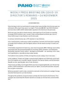 Good morning to all of you and thanks for joining today’s press briefing. Over the last week, we witnessed a 23% jump in new cases in our region. There were 880,583 new COVID infections and more than 15,000 COVID-related deaths reported in the Americas in the past week. Most new cases took place in North America, where both the US and Canada are reporting increasing COVID incidence rates. Canada’s Yukon and Northwest territories saw a two-to-three-fold increase in new infections over the last week. In contrast, Central America saw a 37% reduction in new infections. Yet, in South America, nearly every country except Brazil, Suriname and Venezuela is reporting increasing COVID incidence, with the highest jumps in the last week occurring in Ecuador and Paraguay. In the Bolivian department of Santa Cruz, cases have increased by 400% following recent strikes and protests that also prevented people from accessing COVID vaccination and testing sites. Meanwhile Colombia’s tourist centers – like Bogota and Medellin – are reporting a rise in cases and hospitalizations, especially among younger people. The Southern Cone countries of Chile and Argentina are also seeing a rise in new cases. In the Caribbean, Trinidad and Tobago is experiencing its highest-ever COVID rates and at least five of its hospitals are at over 80% capacity. Barbados, the Cayman Islands, and the Dominican Republic are also reporting high rates of new infections. These trends are telling. Even though COVID cases have dropped significantly over the last few months, COVID transmission is still active across our region, so every time we lower our guard, the virus gains momentum. Before we proceed, I want to take a moment to comment on the trends we’re seeing in Europe, and what that means for us in the Americas. Throughout this pandemic, Europe has been a window into the future for the Americas. Time and again we’ve seen how the infection dynamics in Europe are mirrored here, several weeks later. And over the last weeks, many European countries have reported record numbers of new cases. In eastern Europe, relatively lower vaccination coverage has led to an increase in cases. While many Western European countries have achieved substantial vaccination coverage, they still have significant pockets of unvaccinated people. And in many cases, public health measures have been relaxed, creating the perfect environment for this virus to spread. The future is unfolding before us, and it must be a wakeup call for our region because we are even more vulnerable. While 51% of people across Latin America and the Caribbean have been fully vaccinated against COVID-19, there are 19 countries in our region that have not reached the WHO targets to vaccinate 40% of the population of every country by the end of this year and 70% by mid-2022. Even though vaccination coverage is not as high as we’d hope, in many densely populated areas of the Americas, preventive measures have been lifted or relaxed. This is a worrisome combination that keeps us vulnerable to the virus and threatens our hard-fought gains. With the approaching holidays and upcoming summer vacations in the Southern Hemisphere, I wish to take a moment to remind everyone that our individual and collective decisions chart the path of this pandemic. We have been here before. Our region witnessed a large jump in new cases following last year’s holiday season and it took months for countries to reduce the incidence of new cases. This year, we are better off than the last for one simple reason: we have more tools to protect ourselves from this virus. That’s why today I want to urge two main messages. The first, is that vaccines work. The WHO has authorized eight COVID-19 vaccines that are safe and effective against this virus. Other vaccines have also been approved by national regulatory authorities in several countries. Our hospitals offer the best proof of the power of these vaccines. Mere months ago, hospital beds and intensive care units across our region were at capacity, leaving many COVID patients with nowhere to turn. But over the last year, more than 1.3 billion COVID-19 vaccine doses have been administered in the Americas, giving us protection against serious COVID illness that would often require hospitalization. As we’ve seen in the US, Chile, Cuba, Uruguay, Canada, Panama, El Salvador, and other countries where most of the population is immunized, these vaccines have helped lower hospital bed occupancy. PAHO is working to expand vaccine access in the region, especially in places that are falling behind. But vaccines are not the only tool to protect us against COVID. That’s why the last point I want to stress is that public health measures are key to reducing the spread of this virus. Mask wearing, social distancing and avoiding large gatherings, especially indoors, will remain important – even as more of us get vaccinated. There is no room for complacency because we’ve already faced the consequences of an uncontrolled pandemic and we don’t want to be in that position again. As we enter the time of year for reflection and celebration, give a gift to your friends and family by getting vaccinated when it’s your turn. If you’re planning on seeing loved ones this season, keep your gatherings small – to the extent possible – and outdoors when you can. If you must gather inside, open your windows so air can circulate. For anyone who is planning to pack their bags, please get vaccinated before you leave. And don’t forget to wear a mask during your trip and follow the public health guidance at your destination. The decisions we take over the next few months will determine the course of the next year. It is really up to all of us to make smart and safe choices this holiday season so we can protect ourselves and each other from this virus. |