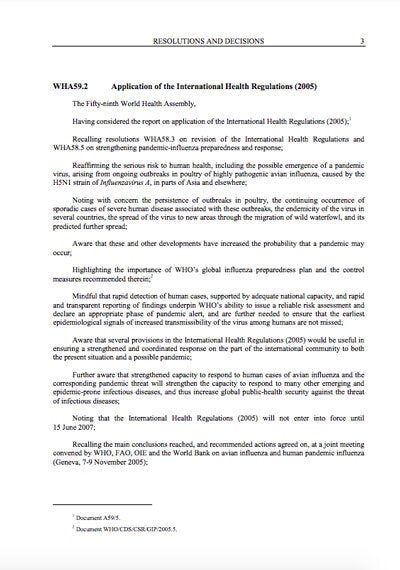 The Fifty-ninth World Health Assembly, Having considered the report on application of the International Health Regulations (2005); Recalling resolutions WHA58.3 on revision of the International Health Regulations and WHA58.5 on strengthening pandemic-influenza preparedness and response; Reaffirming the serious risk to human health, including the possible emergence of a pandemic virus, arising from ongoing outbreaks in poultry of highly pathogenic avian influenza, caused by the H5N1 strain of Influenzavirus A, in parts of Asia and elsewhere; Noting with concern the persistence of outbreaks in poultry, the continuing occurrence of sporadic cases of severe human disease associated with these outbreaks, the endemicity of the virus in several countries, the spread of the virus to new areas through the migration of wild waterfowl, and its predicted further spread; Aware that these and other developments have increased the probability that a pandemic may occur; |