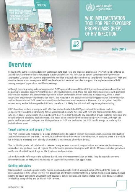 WHO implementation tool for pre-exposure prophylaxis of HIV infection