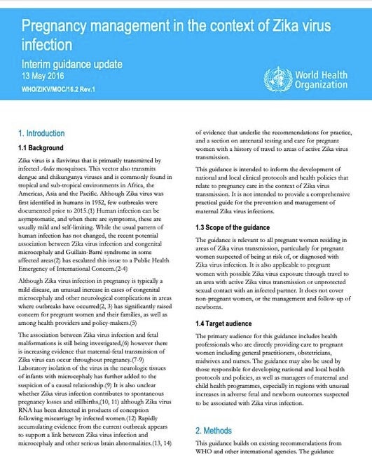 The aim of this document is to provide interim guidance for interventions to reduce the risk of maternal Zika virus infection and to manage potential complications during pregnancy. This guidance is based on the best available research evidence and covers areas prioritized by an international, multidisciplinary group of health care professionals and other stakeholders. Specifically, it presents guidance for preventing Zika virus infection;antenatal care and management of women with infection; and care during pregnancy for all pregnant women living in affected areas, with the aim of optimizing health outcomes for mothers and newborns. The guidance is intended to inform the development of national and local clinical protocols and health policies that relate to pregnancy care in the context of Zika virus transmission. It is not intended to provide a comprehensive practical guide for the prevention and management of Zika virus infections.