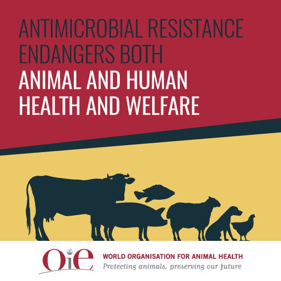 World Antibiotic Awareness Week 2018: OIE - Postcard for social media. "Antimicrobial resistance endangers..."