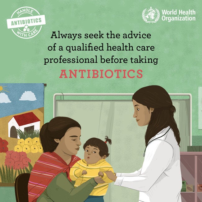 World Antibiotic Awareness Week 2018: Postcard for social media. "Always seek advice of..."