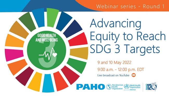 The Pan American Health Organization/World Health Organization (PAHO/WHO), is pleased to invite you to the webinar series on the Advances on Equity to achieve the Sustainable Development Goals (SDG 3), which will take place on 9 and 10 May 2022, from 9:00 a.m. to 12:00 p.m. (EDT). The seminars are part of a process to recover the loss experienced during the COVID-19 pandemic of what had been achieved up to that moment, and to accelerate the path towards the achievement of the 2030 agenda in the Region.