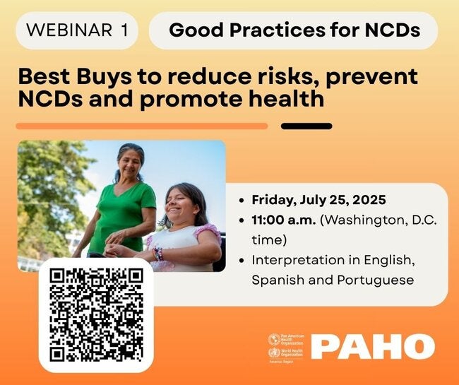 Join us on Friday, July 25, 2025, at 11:00 am (EDT) on the webinar Best Buys to reduce risks, prevent NCDs and promote health, to facilitate the exchange of experiences in NCD prevention and learning among countries in the region, identifying successful strategies that integrate health promotion and intersectoral action to address the social determinants related to tobacco use, diet, physical activity, and alcohol.