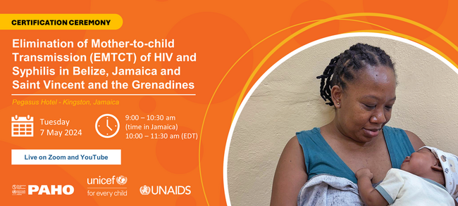 Don't miss the certification ceremony on Tuesday, May 7, 2024, at 9:00 a.m. (Kingston time) /10:00 a.m (Washington D.C. time or EDT), celebrating the achievement of eliminating mother-to-child transmission (EMTCT) of HIV and Syphilis in Belize, Jamaica, and Saint Vincent and the Grenadines.