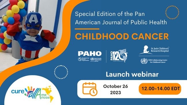 Join us on Thursday, October 26, 2023, from 12:00 p.m. to 2:00 p.m. (EDT) for the launch of the special supplement of the Pan American Journal of Public Health on childhood cancer. This special supplement highlights the joint accomplishments of the Pan American Sanitary Bureau, St. Jude Children´s Research Hospital, and the Member States and reminds us that there is still a long way to go to ensure full implementation of the WHO CureAll framework in the Americas
