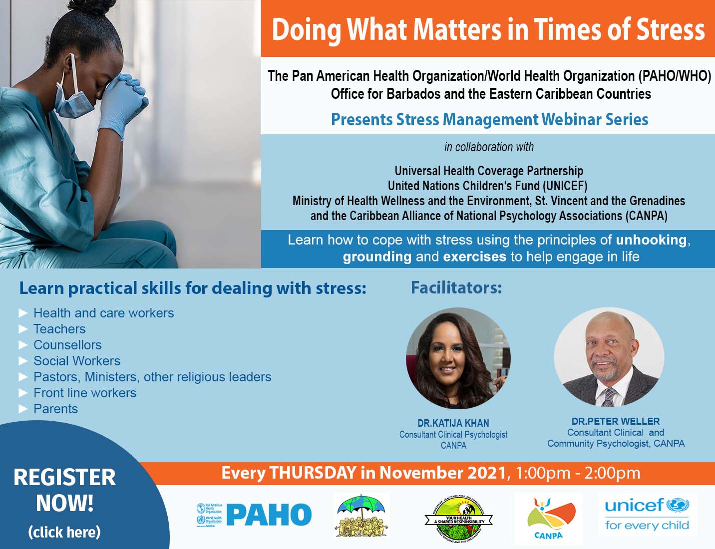 The PAHO/WHO Office for Barbados and the Eastern Caribbean Countries presents a Stress Management Webinar series in collaboration with Universal Health Partnership, the United Nations Children’s Fund (UNICEF), the Ministry of Health Wellness and the Environment, St. Vincent and the Grenadines and the Caribbean Alliance of National Psychology Associations (CANPA).