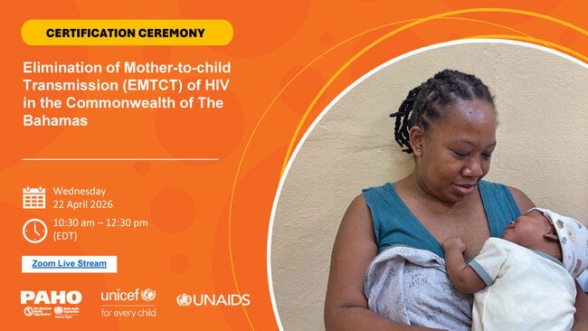 Elimination of Mother-to-child Transmission (EMTCT) of HIV in the Commonwealth of The Bahamas DetailsDate: Wednesday 22 April 2026Time: 10:30 am -12:30 pm (EDT) Zoom Live Stream For other cities, please check your local time zone. Webinars Communicable Diseases HIV/AIDS Elimination of Mother-to-Child Transmission of HIV, Syphilis,Hepatitis B, and Chagas The Bahamas Communicable Disease Prevention, Control, and Elimination Diseases Elimination Initiative