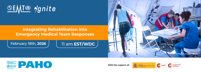 The Pan American Health Organization (PAHO) invites you to participate in a new edition of EMT Ignite: “Integrating Rehabilitation into Emergency Medical Team Responses”, to be held on Wednesday, February 18, 2026, at 11:00 a.m. EST/WDC.