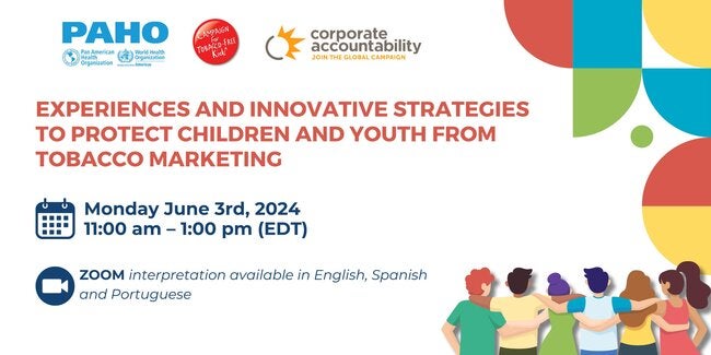 Join us on Monday, June 3, 2024 at 11:00 a.m. (Washington DC, or EDT) at the webinar Experiences and Innovative Strategies to Protect Children and Youth from Tobacco Marketing, organized jointly by the Pan American Health Organization, Campaign for Tobacco-Free Kids, and Corporate Accountability. This event will commemorate World No Tobacco Day 2024 (May 31), whose goal this year is to provide a platform to youth who demand that the tobacco industry stop targeting this group with products harmful to their health.