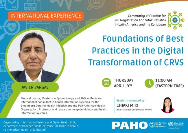 In this session, Javier Vargas, international consultant in health information systems, will present a practical framework of best practices to guide CRVS digital transformation processes, addressing their legal, institutional, technological, and change management dimensions in an integrated manner.